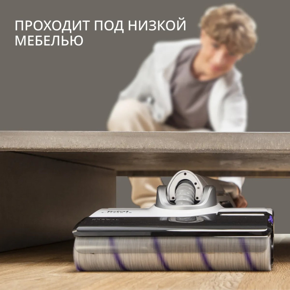 Отсутствие проводов, функция самоочистки и сушки сделают уборку проще и эффективнее. Боковая щётка и безрамочная конструкция гарантируют чистоту в труднодоступных местах и в углах, а также под низкой мебелью, куда не проходит большинство пылесосов.