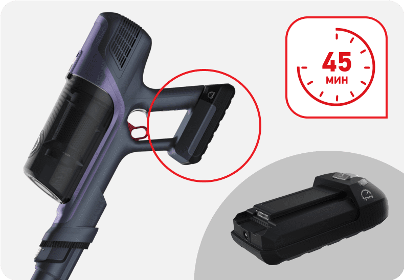 Мощная литий-ионная батарея разработана, чтобы обеспечивать длительную автономную работу в течение 45 минут в режиме ECO для чистоты полов независимо от размеров вашего дома.