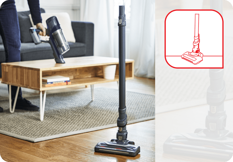 C парковкой Stop&Go уборка станет ещё комфортнее, так как трубка и щётка остаются в зафиксированном положении, пока вы пользуетесь ручным пылесосом. Вертикальная парковка также позволяет компактно хранить ваш пылесос.