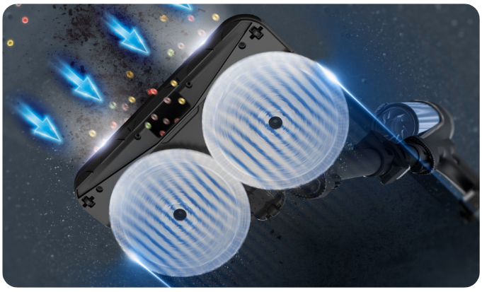 Две вращающиеся тряпки из микрофибры удваивают эффективность уборки, сочетая всасывание пыли с удалением стойких пятен.