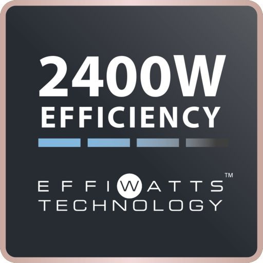 Высокая эффективность сушки благодаря эффективной мощности 2400 Эффиватт, которая эквивалентна мощности 2400 Вт при фактическом потреблении всего 1900 Вт*.