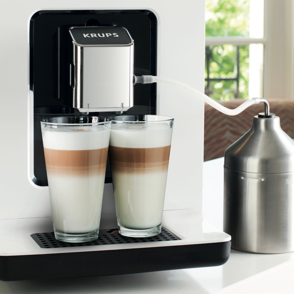 Вы можете использовать контейнер для молока в комплекте или просто опустить трубку капучинатора в пакет с молоком и приготовить одним касанием 2 капучино или латте.