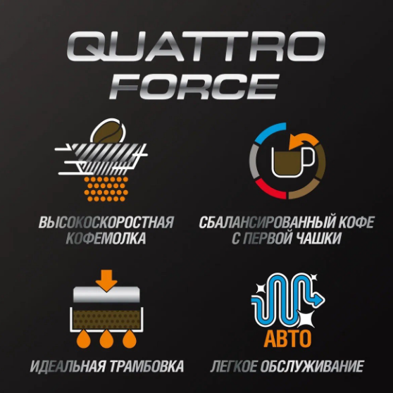 Эксклюзивная технология KRUPS Quattro Force оптимизирует процесс приготовления кофе на всех этапах – от идеального помола до приготовления и очистки, – позволяя каждый раз получать ароматный и насыщенный кофе профессионального качества.
