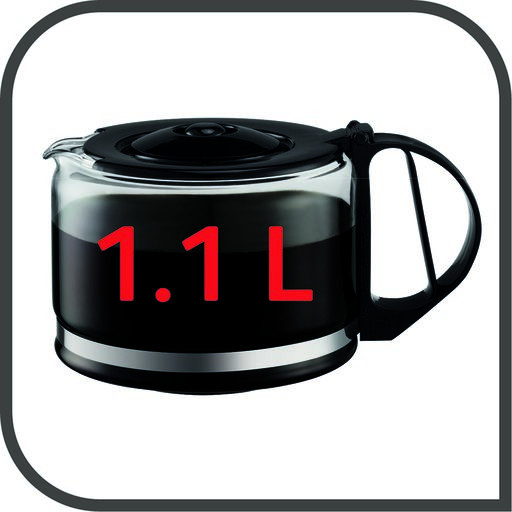 Кувшин выполнен из термостойкого стекла и имеет объем 1,1 л – этого хватит на 12 чашек свежесваренного кофе.