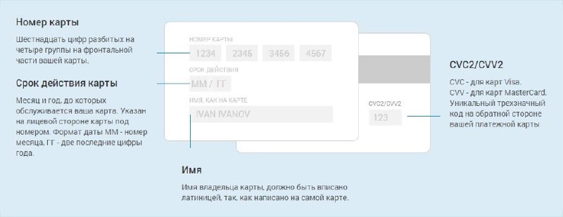 - После переадресации на защищенную страницу банка ввести номер карточки, срок ее действия, имя владельца карты и уникальный трехзначный код: